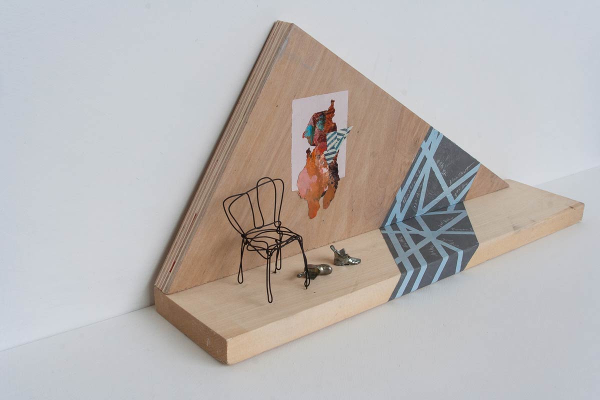 - An Extended Stopover, 2015, mixed media on wood scraps, 16.5″ x 8″ x 3.5″, SOLD